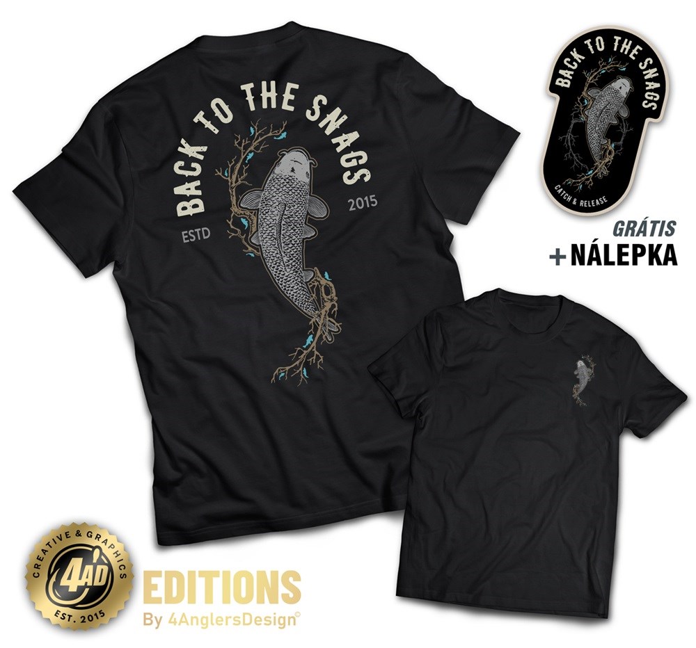 Veľký motív Back To The Snags na chrbte a malý motív kapra na hrudi.