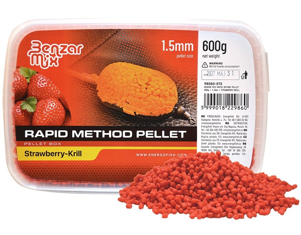 Rapid Method Pellets sú obilné pelety bez obsahu rybej múčky. Obsahujú tradičné obľúbené zložky kaprov, ako je kukurica. Pelety majú živé, výrazné farby a sú k dispozícii v dvoch veľkostiach - 1,5 mm a 3,5 mm.
