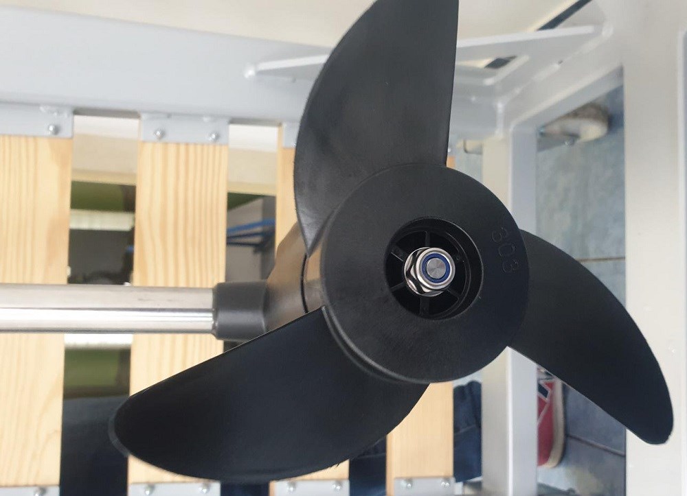 Elektromotor je odolný aj do slanej vody. Na motore je ukazovateľ stavu batérie. Rukoväť motora je odolná a sklopná, vďaka tomu nepotrebujete toľko miesta napríklad v kufri auta, taktiež je možné nastaviť optimálny uhol. Noha motora v držiaku je posuvná hore a dole, vďaka tomu je možné dať na akúkoľvek loď a "vyladiť" najlepšiu účinnosť motora.
