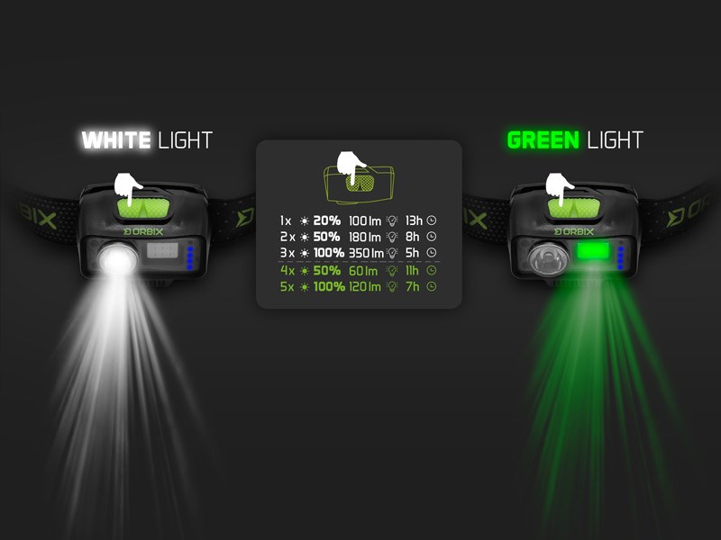 Na čelovke sa nachádzajú dve LED diódy, ktoré ponúkajú možnosť bieleho alebo zeleného svetla. Pri prvom stlačení spínacieho tlačidla sa rozsvieti biele svetlo s intenzitou 20% (100lm), pričom batéria vydrží 13h. Opakovaným stlačením sa aktivuje režim 50 % s výdržou 8 hodín, a tretím stlačením sa rozsvieti biele svetlo na 100 %, pričom batéria vydrží 5 hodín.