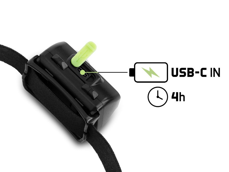 Čelovka má v sebe zabudovanú 1200 mAh batériu, ktorá sa nabíja prostredníctvom USB-C kábla. Plné nabitie trvá približne 4 hodiny. Na tele čelovky sa nachádza indikátor batérie, ktorý zobrazuje aktuálny stav nabitia.