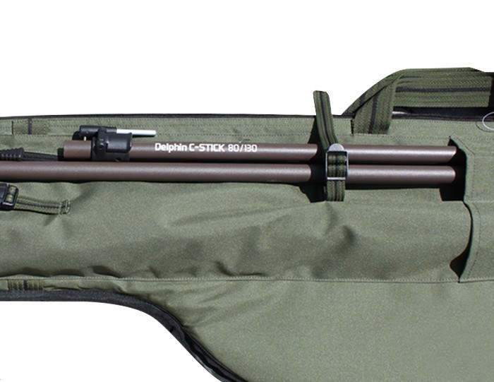 Model má po strane extra dlhé vrecko so zipsom, ktoré slúži napríklad na transport rybárskeho podberáku. Na ňom sú našité uloženia na rázsošky aj so sťahovacou páskou. Toto puzdro tak pojme väčšinu ťažko skladného rybárskeho náčinia.