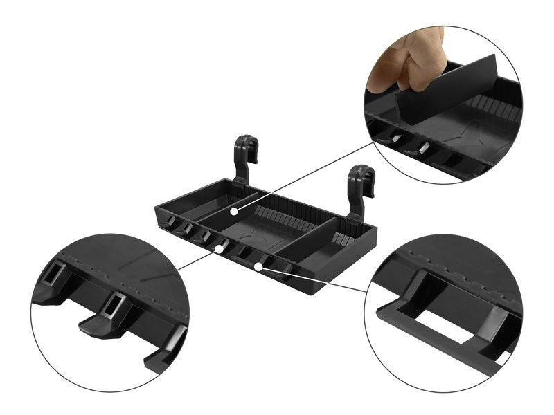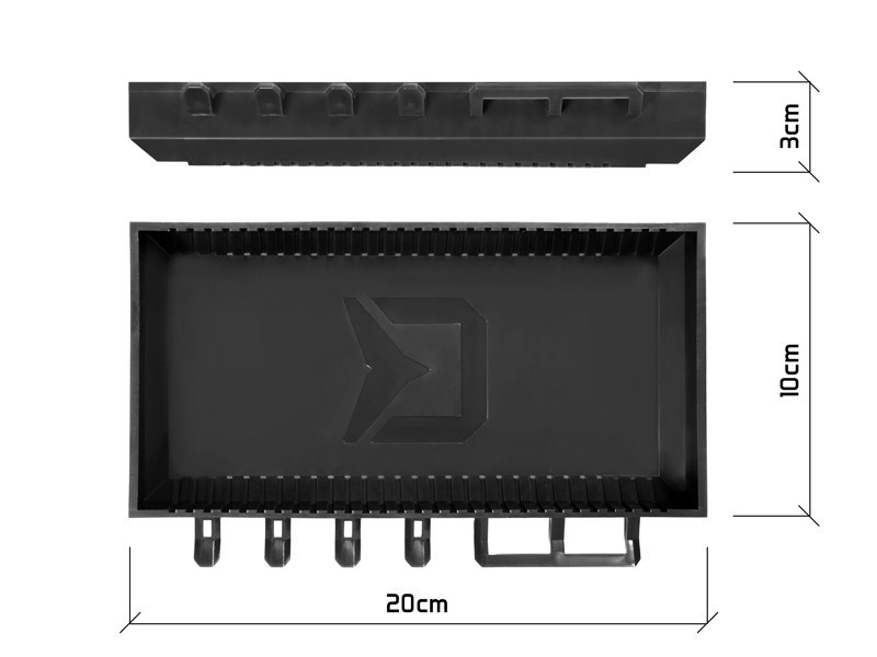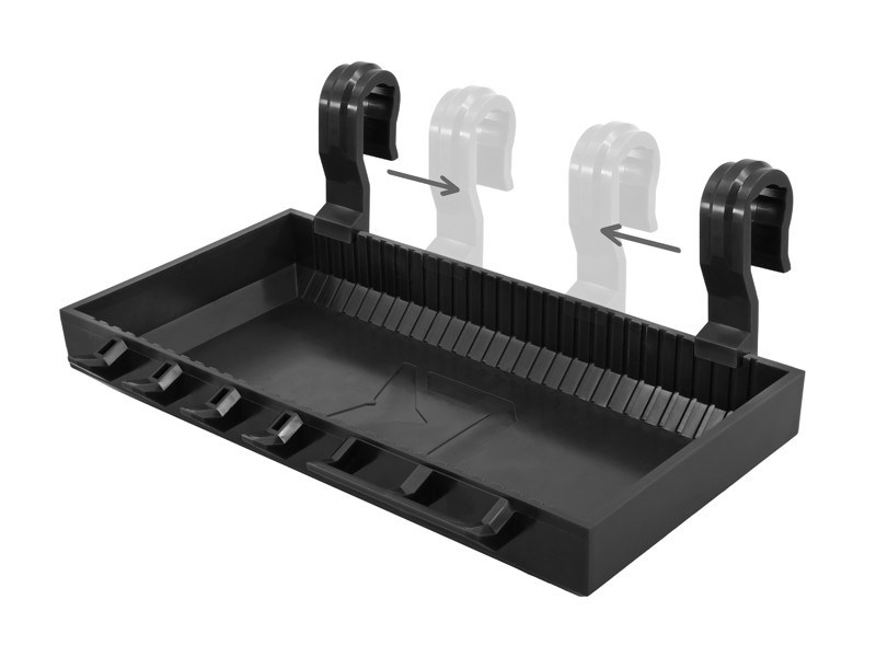 Ďalším doplnkom sú háčiky v prednej časti slúžiace na zavesenie náväzcov, prípadne zasunutie ihly, nožníc alebo iné pomôcky potrebné počas lovu. Vyberateľné prepážky umožňujú optimalizovať úložný priestor presne podľa vašich predstáv. Polička je navrhnutá v obľúbenom čiernom dizajne BlackWAY a teda skvele doplní stojany z našej produkcie.