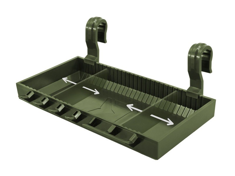 Ďalším doplnkom sú háčiky v prednej časti slúžiace na zavesenie náväzcov, prípadne zasunutie ihly, nožníc alebo iné pomôcky potrebné počas lovu. Vyberateľné prepážky umožňujú optimalizovať úložný priestor presne podľa vašich predstáv. Polička je navrhnutá v obľúbenom čiernom dizajne BlackWAY a teda skvele doplní stojany z našej produkcie.