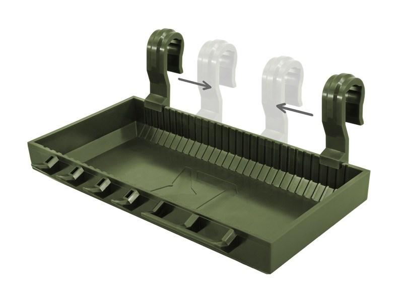 ShelfPOD má vyvýšené okraje, vďaka ktorým zostanú uložené predmety na svojom mieste. Dno je perforované a umožňuje vytečenie prebytočnej vody po daždi. Dva pevné plastové háky umožňujú ľahké a rýchle zavesenie na stojan a nakoľko sú odnímateľné, je možné si poličku preniesť do bivaku alebo na stolík.