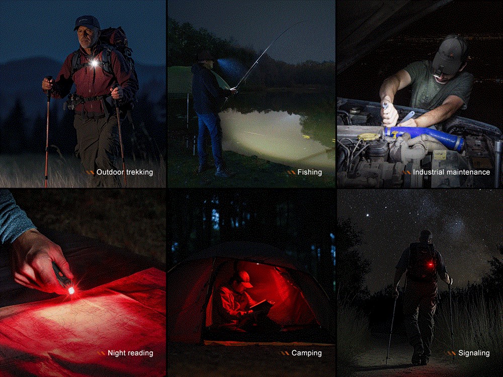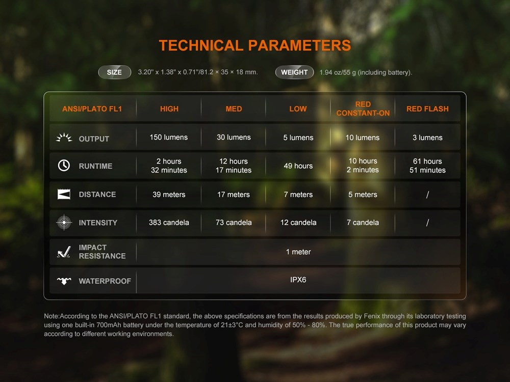 •Tri režimy bieleho svetla: 150 lúmenov (2,5 hodiny) -> 30 lúmenov (12,3 hodiny) -> 5 lúmenov (49 hodín).