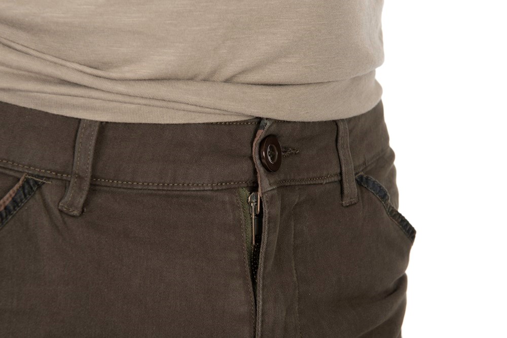 •Čiastočne elastický pás s pútkami na opasok a zapínaním na gombík