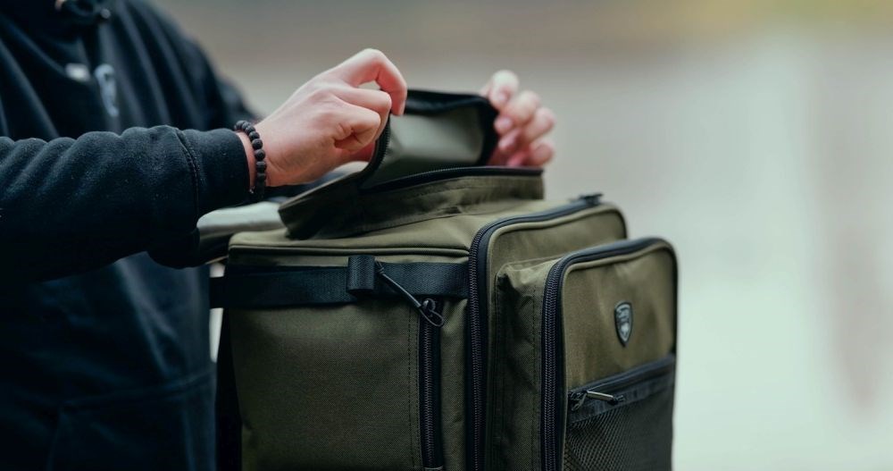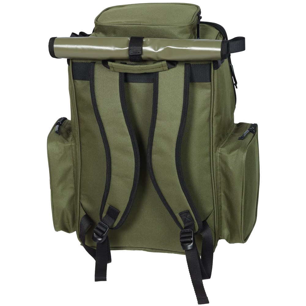 Batoh je vyrobený z nylonu 300D, v elegantnom dvojfarebnom zeleno-čiernom dizajne. Tento zosilnený materiál, ktorý je z vnútornej časti pogumovaný zabráni premoknutiu batohu a je ľahko umývateľný. Batoh je osadený predným výklopným väčším vreckom a menšie vrchné vrecko je určené na uchovanie dokladov, kľúčov a pod, posledné dve bočné sú hlavne určené na fixáciu prútov či podberáka, ale zmestia sa tam rôzne rybárske doplnky. Batoh má polstrované popruhy, ktoré majú šírku 7 cm a sú dĺžkovo nastaviteľné. Spodná ochranná časť z vystuženého PVC, ktorá ochráni batoh pred znečistením a je možné ju ľahko zrolovať.