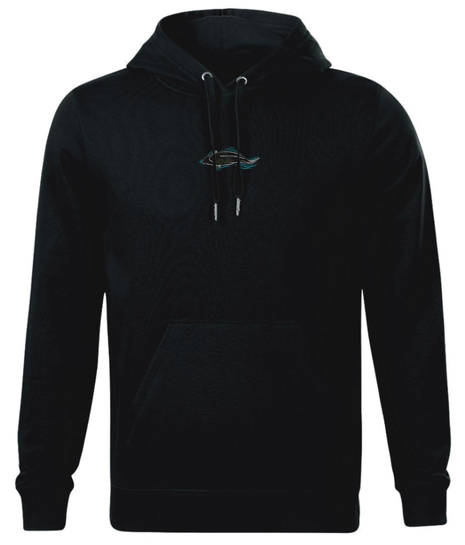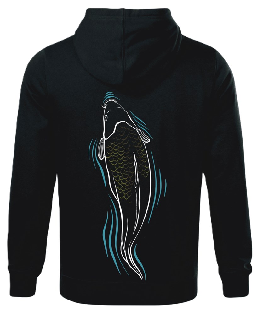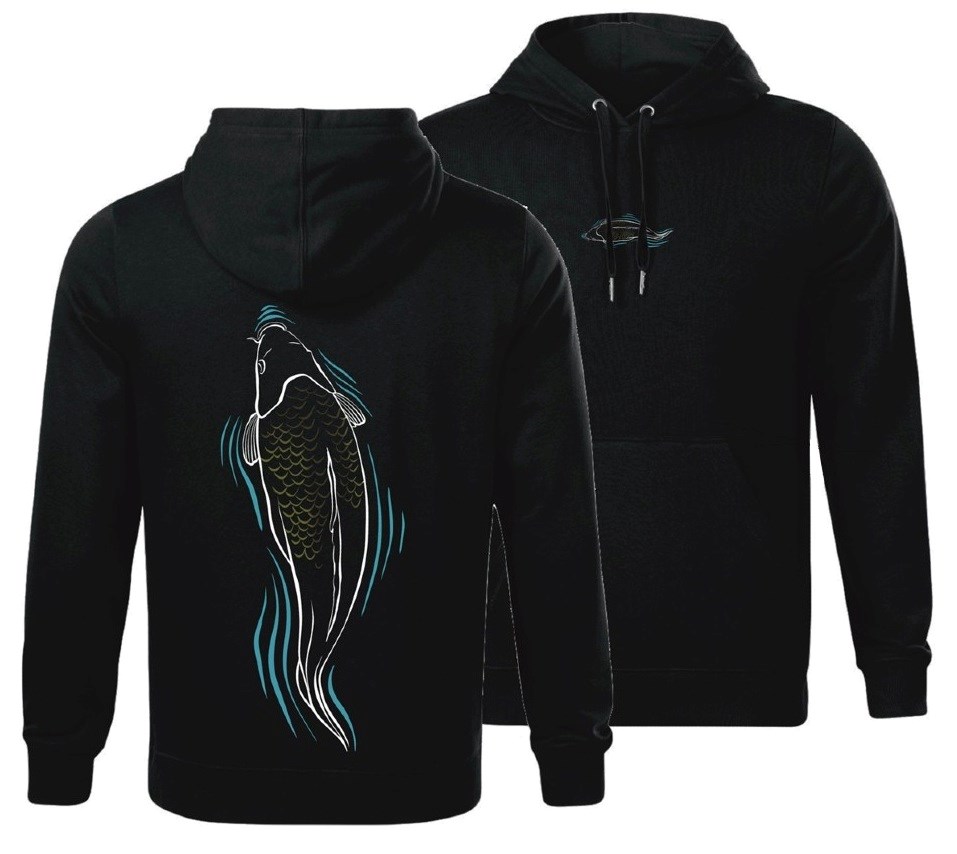 Mikina čiernej farby s našim originálnym návrhom plávajúceho kapra pri hladine. Decentný návrh kapra na prsiach a väčší motív na chrbte.