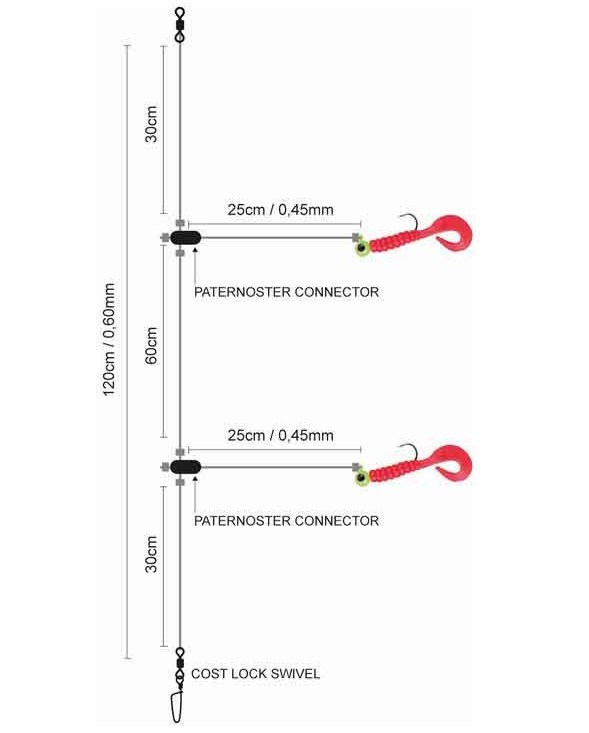 Každý páternoster je vybavený 1, alebo 2 ľahkými jigovými hlavami, UV aktívnymi twistermi a ostrými háčikmi. Jigové hlavy zaisťujú prirodzenú prezentáciu.