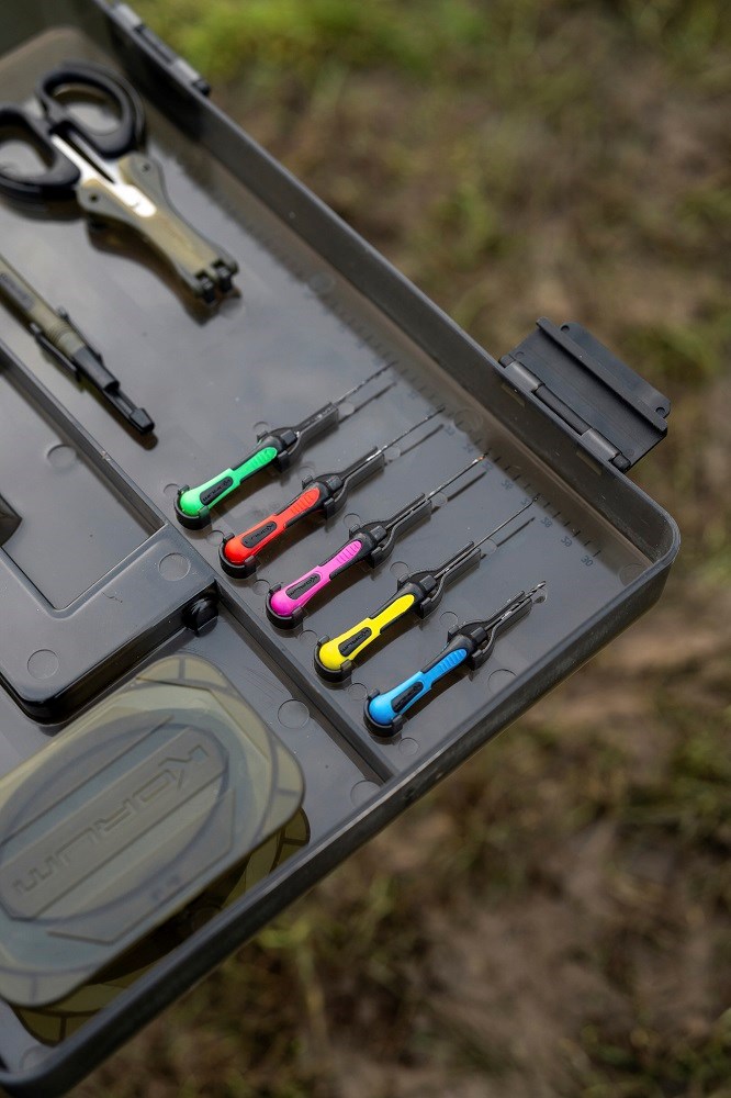 Vaše nástroje na kŕmenie, odháčkovávač a nožnice sa pohodlne zakliknú na svoje miesto, zatiaľ čo hlavnú časť boxu je možné upraviť pomocou prepážok podľa vašich potrieb. Veko obsahuje dva plytké RIG BLOX, ktoré udržia všetky vaše predviazané náväzce v bezpečí pred vplyvmi počasia.