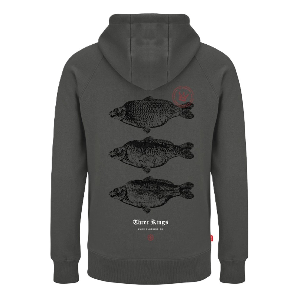 Naša mikina s kapucňou 3 Kings bola ručne vyrobená technikou známou ako „pointilizmus“, ktorá využíva milióny drobných bodiek na vytvorenie svetlých a tmavých plôch. Oslavujeme 3 druhy kaprov kráľovských, ktoré všetci lovíme. Trojfarebná sieťotlač na super mäkkej organickej látke s gramážou 320 g vo farbe „bridlicovo šedej“ s tkanými bočnými chlopňami.