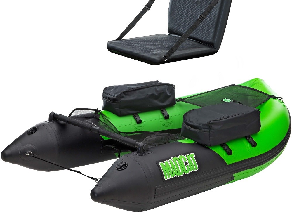 Počas vývoja sme dbali na maximálnu silu, bezpečnosť a stabilitu. Preto je tento belly čln vyrobený z 0,70 a 0,80 mm hrubého PVC a na stranách má široký ochranný pruh. Vysoko viditeľná zelená farba MADCAT zaisťuje, že bude rybár na belly Boate dobre viditeľný pre ostatných a lodnú dopravu. Pre maximálnu stabilitu a kontrolu nad zdolávanými rybami je tento belly boat dlhší (170cm) než väčšina ostatných belly Boatov na trhu. Vďaka vysokej nafukovacej sedačke, ktorá uľahčuje dosiahnuť na hladinu s vábničkou, sa tento belly boat stáva ešte vhodnejší pre lov sumcov. Ide skrátka o špičkový odolný sumcový belly boat. Dodáva sa so sadou na opravu, nožnou pumpou a transportnou taškou.