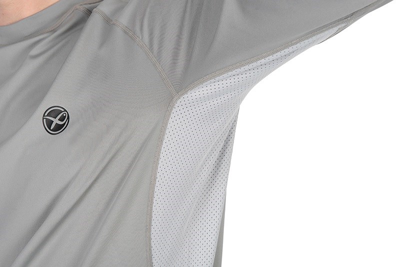 Tričko je vyrobené z ľahkej a priedušnej látky s ochranou UPF40+. Sieťové panely v podpazuší zlepšujú cirkuláciu vzduchu. Šedá látka odráža teplo.