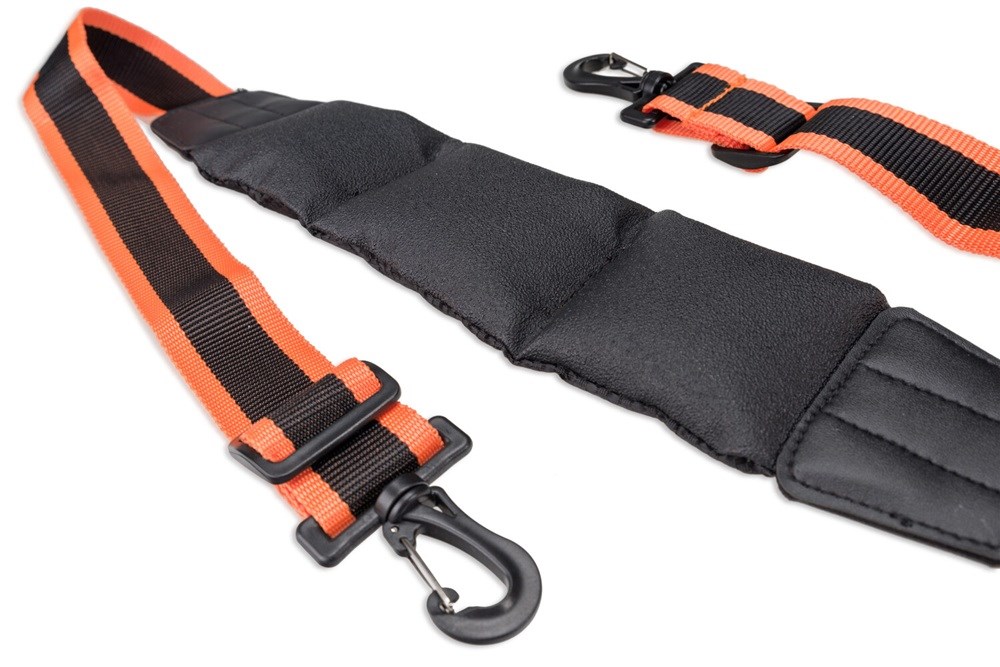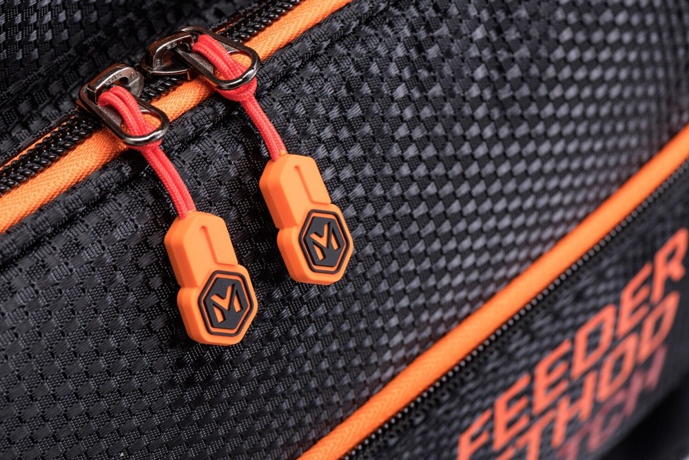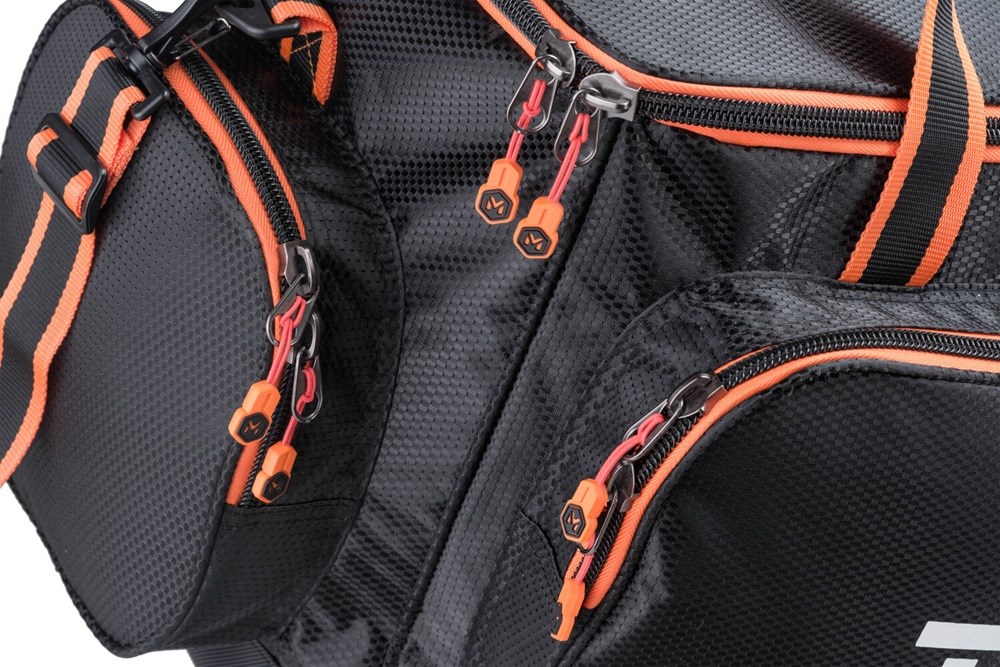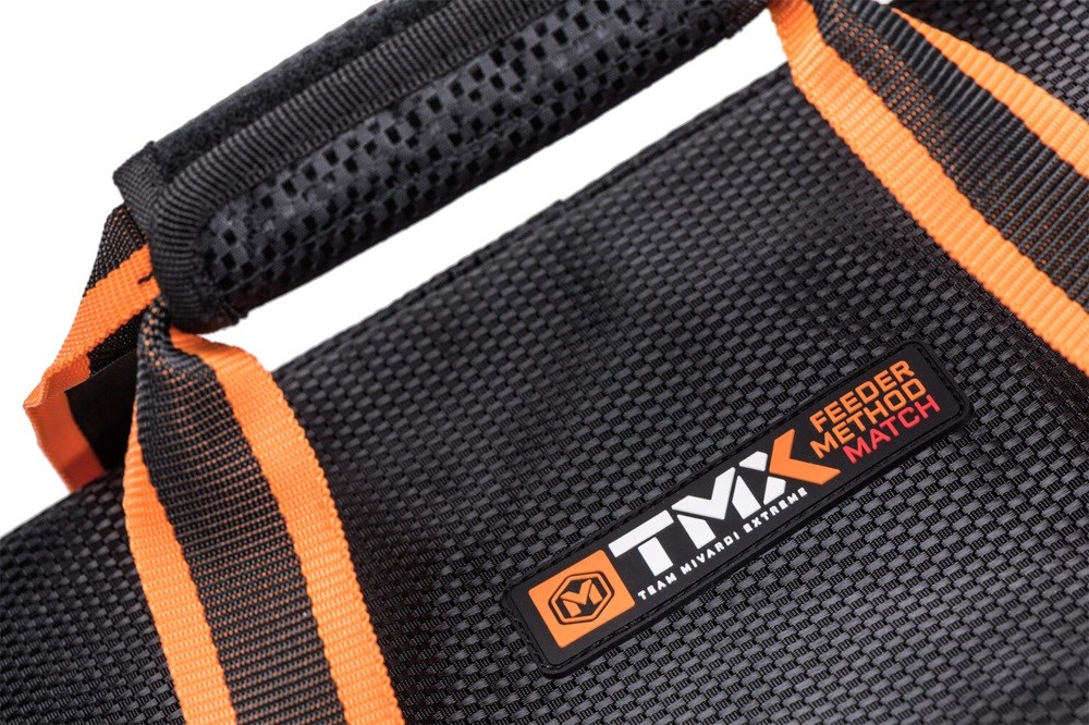 Hlavná komora aj všetky vrecká sú vďaka použitému matreriálu výrazne vystužené. Taška je opatrená pevnými ušami na nosenie v ruke a nastaviteľným luxusným popruhom cez rameno s extrémne silným polstrovaním. v štýle splietaného carbonu. Tento materiál je úplne nepremokavý a výborne umývateľný. Na celej sérii TMX sú použité záťažové zipsy najvyššej kvality s praktickými tiahlami Mivardi.