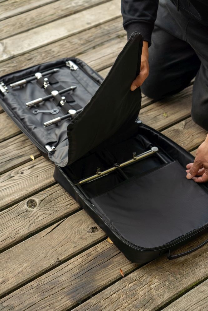 Stojan je navrhnutý tak, aby sa dal použiť ako celok, ale aj len jeho časti a ponúkol tak širokú škálu použitia. Stojan z uhlíkovej a nerezovej ocele v sebe spája precíznu konštrukciu, ohromujúcu ergonómiu a vďaka starostlivému dizajnu a kombinácii materiálov skvele drží krok s konštrukciou.