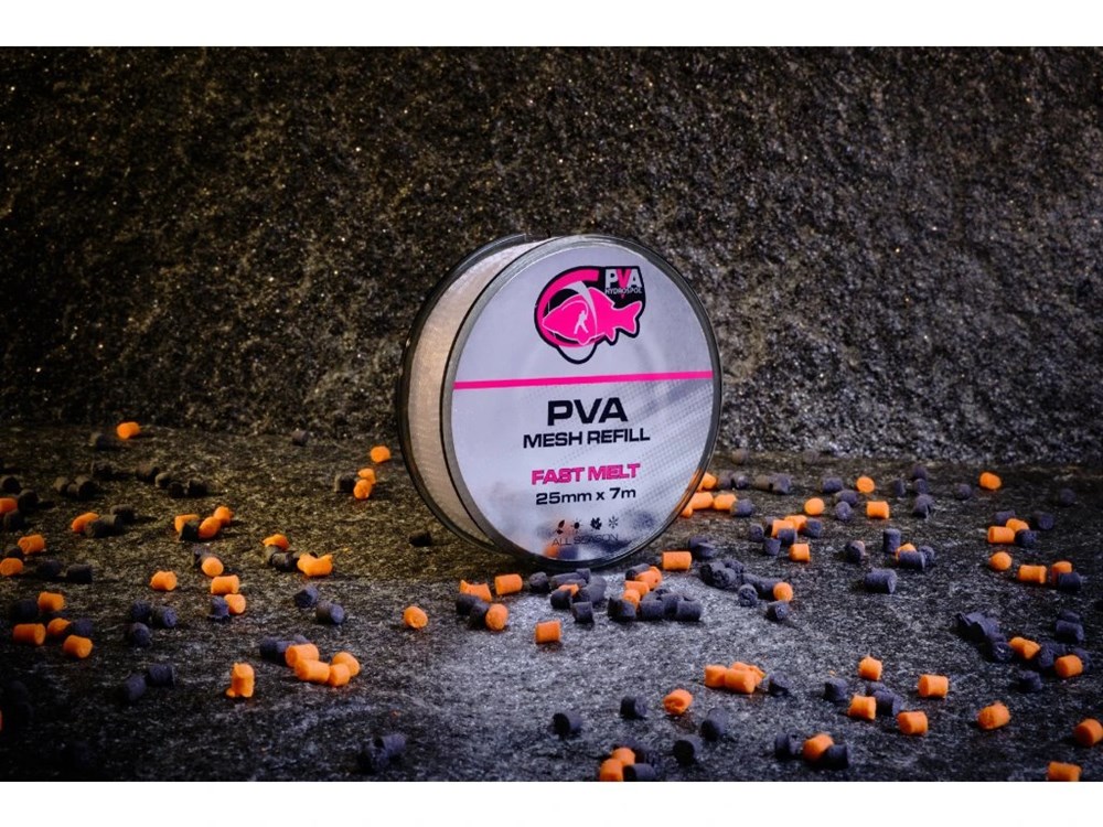 PVA náhrady sú vhodné na doplnenie pančuchy na prázdny tubus. Ako názov napovedá jedná sa o rýchlorozpustnú verziu pančuchy. Ako výrobcovia PVA produktov sme usilovne pracovali na variante pančúch, ktorá zvládne plniť hneď niekoľko vlastností naraz. Na výrobu novej pančuchy sme opäť zvolili kvalitné japonské vlákna, ktoré majú polovičný čas rozpadu oproti vláknam v našej klasickej verzii. Zakladáme si na kvalite, ale aj štýle pletenia pančúch, naši zákazníci sa môžu znova tešiť na hustý micro-mesh, do ktorého je možné plniť drobné kŕmené, sypké materiály a použiť ju tak môže naozaj každý rybár. Vďaka zvolenému úpletu môžete PVA pančuchy Fast melt používať dokonca aj v teplých vodách. To z nej robí skvelú pančuchu na celoročné použitie.