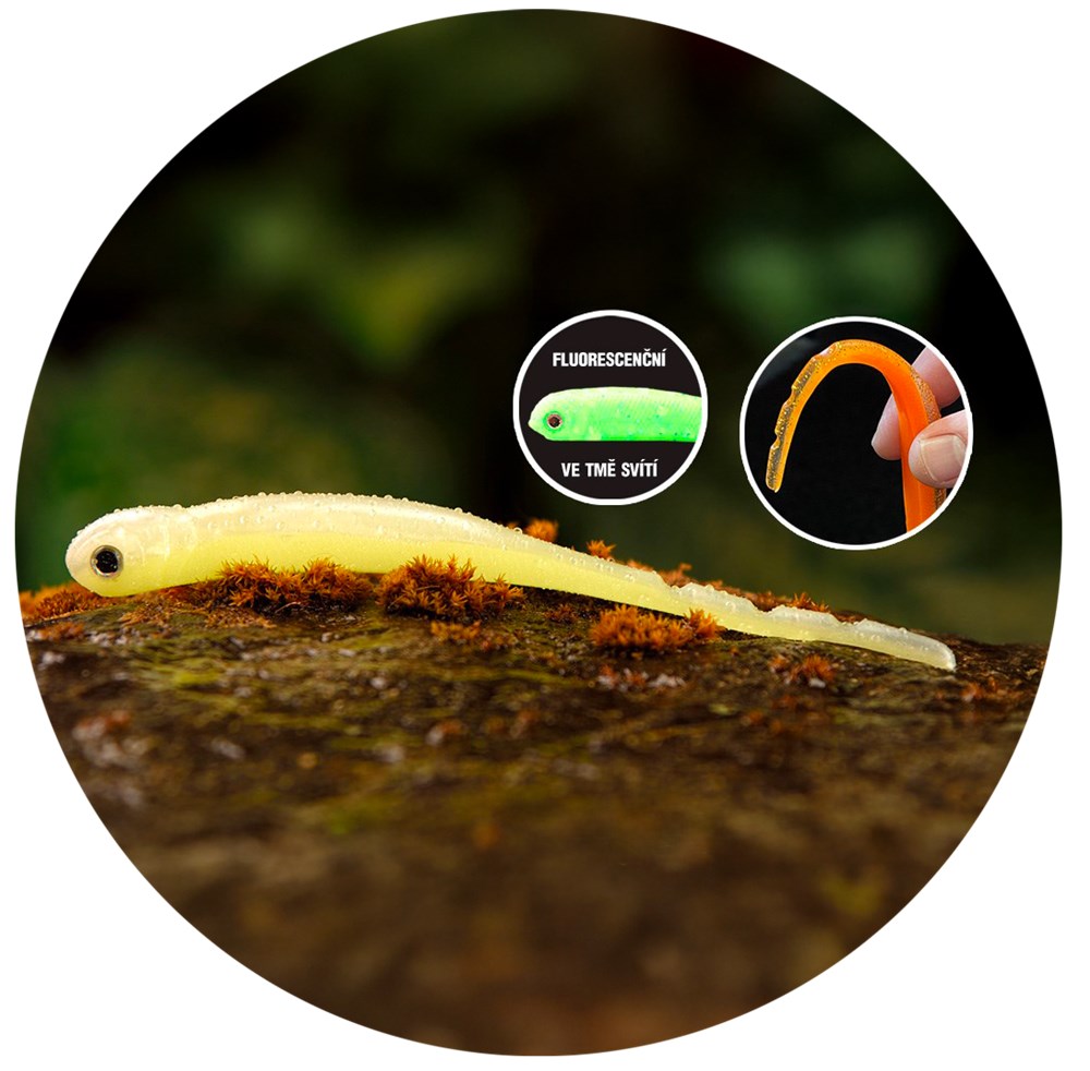 Ručne vyrábaný extra mäkký špičkový zmáček, ktorý ryba len tak "nevypľuje" a vďaka použitému mimoriadne mäkkému materiálu sa ho po zábere snaží prehltnúť! Vďaka prepracovaným povrchovým detailom tela (skrelové oblúky, rybia papuľa a pod.), 3D očiam a vyskúšanému tvaru by mal byť neoddeliteľnou súčasťou vašej výbavy.