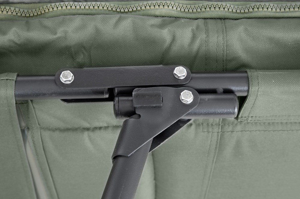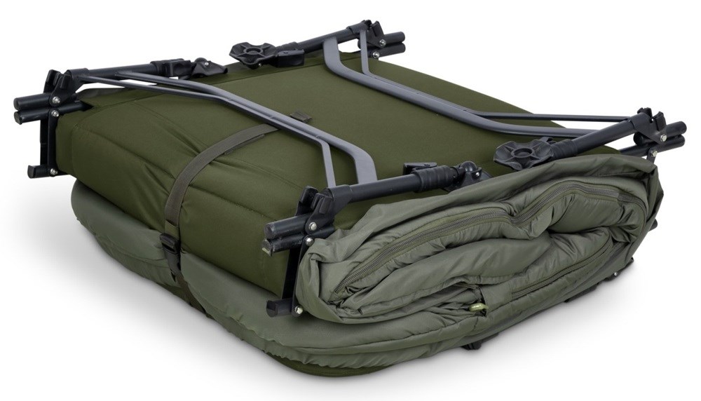 Lehátko má rám vyrobený z ocele a hliníka so 100% rovným profilom. Nohy sú široko rozložené a každá má krátku opornú časť pre väčšiu pevnosť a stabilitu. kompaktnejšie zloženie spacieho systému. Všetky skrutky, podložky a upevňovacie prvky sú z nerezovej ocele, čo zaisťuje ľahkosť aj pevnosť. Zároveň sú na bokoch dve praktické úložné vrecká, ideálne na telefón alebo kľúče od auta.