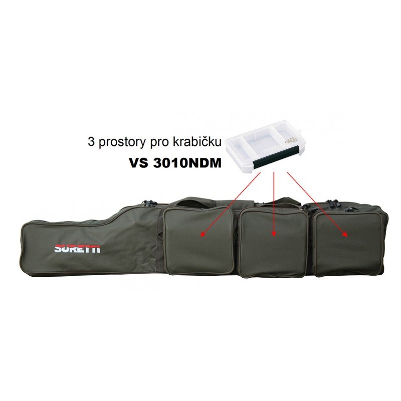 Šírka komory je 11cm, výška 21cm sa v 80cm zužuje na 11cm. To vytvára dostatočný priestor na navijak nasadený na prútu. Na jednej strane je dlhé vrecko s rozmerom 89x9x5cm na podberák a nad ním sú tri vrecká 20x10x5cm na drobnosti, alebo na krabičky Versus typu VS506, VS706 a VS806. Na druhej strane sú tri vrecká s rozmerom 20x20x5cm do ktorých pasujú krabičky typu VS3010NDM. Všade sú použité veľké pevné zipsy s dvoma jazdcami, ktoré majú miesto kovovej rukoväte špagát s plastovým gripom. Obal je ušitý z pevného Nylon Oxford materiálu, ktorý je veľmi pevný a odolný.