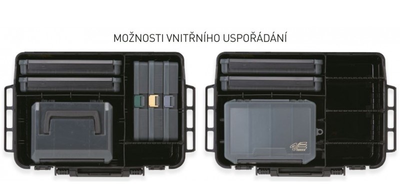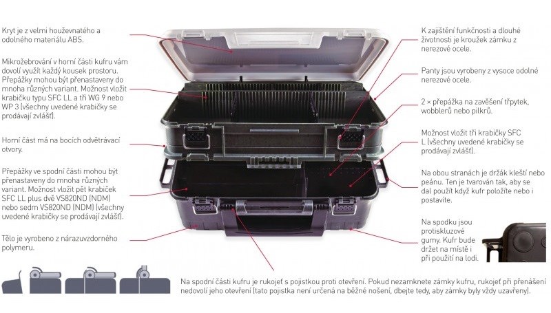 Mikrorebrovanie vám dovolí využiť každý kúsok priestoru. Prepážky môžu byť prenastavené do mnohých rôznych variantov. Istiaci zámok veka zamedzí nechcenému otvoreniu hornej časti pri jeho odklopení. Horná časť má na bokoch odvetrávacie otvory. Na oboch stranách je držiak klieští alebo peánu. Ten je tvarovaný tak, aby sa dal použiť keď kufor položíte alebo i postavíte. Na spodku sú protišmykové gumy. Kufor bude držať na mieste aj pri použití na lodi. Na spodnej časti kufra je rukoväť s poistkou proti otvoreniu. Ak nezamknete zámky kufra, rukoväť pri prenášaní nedovolí jeho otvorení (táto poistka nie je určená na bežné nosenie, dbajte teda, aby zámky boli vždy uzavreté).
